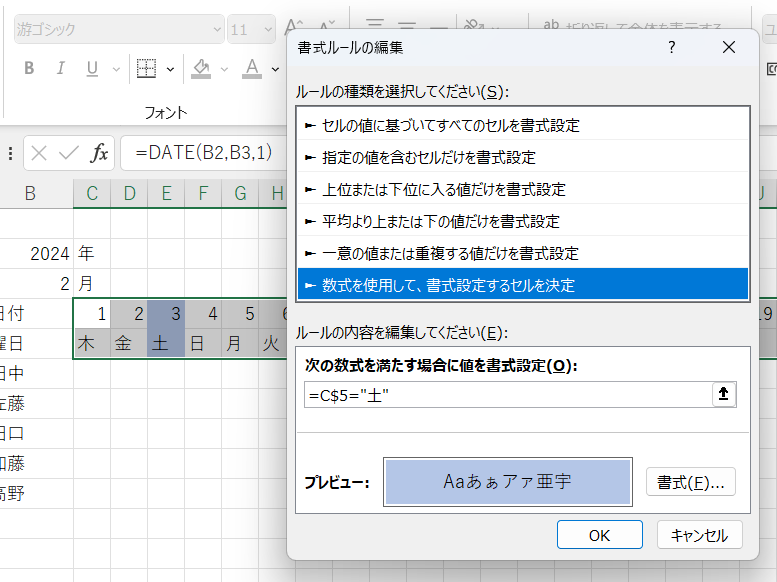今回は土曜日の日付と曜日のセルを水色の背景色に変える設定を行います。