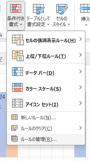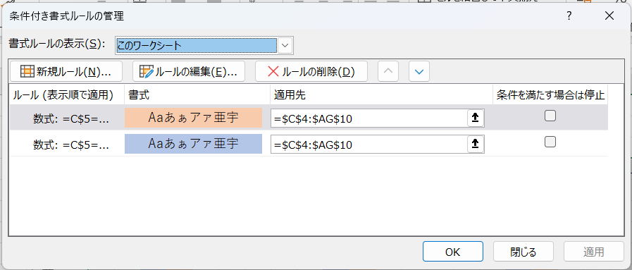 条件付き書式→ルールの管理を選択すると今まで設定したルールの一覧が表示されます。