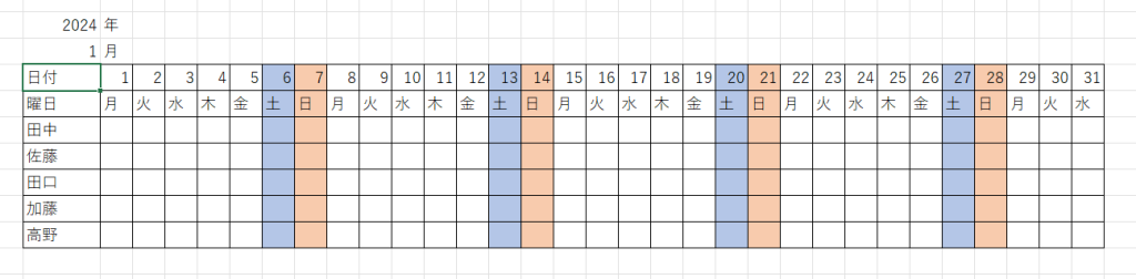シフト表などを作成する場合は下の名簿欄まで曜日の色が付いていると見やすいですよね。