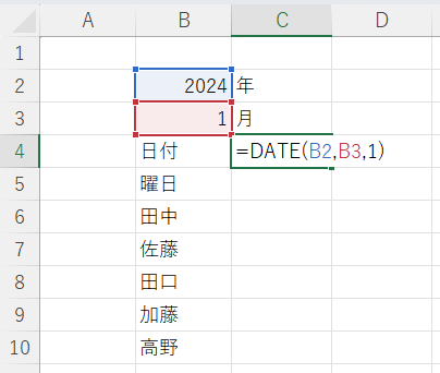 DATE関数の内容としては=DATE(年,月,日)となるため2024年が入っているB2セル、1月が入っているB3セルをそれぞれ入力しています。