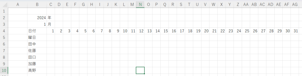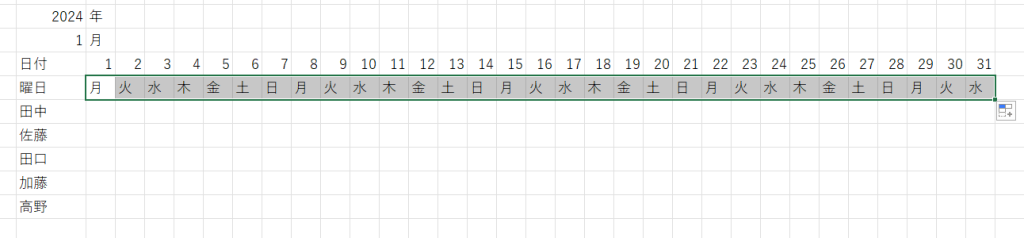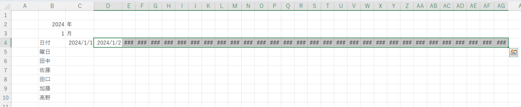D4セルを選択し、オートフィルを用いて2024/1/31の表示されるAG4セルまで伸ばします