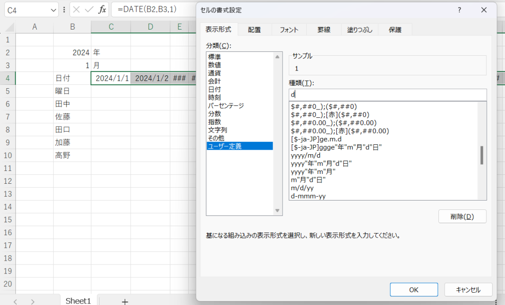 表示形式→ユーザー定義→種類に「d」と入力し、OKボタンを押します。