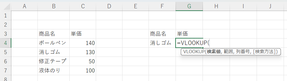 F4セルに商品名を入力すると自動で単価が入力されるようにします。