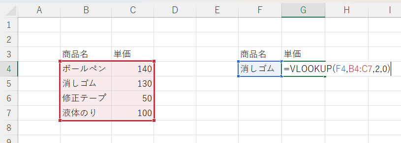 今回の表の場合は「消しゴム」と完全一致する場合に単価を知りたいので「0」または「false」と入力します。