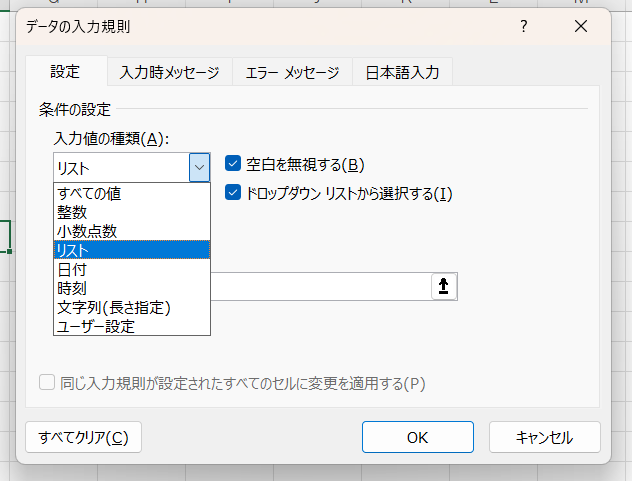 すべてクリアを選択するか、入力値の種類をすべての値にするとドロップダウンが解除されます。