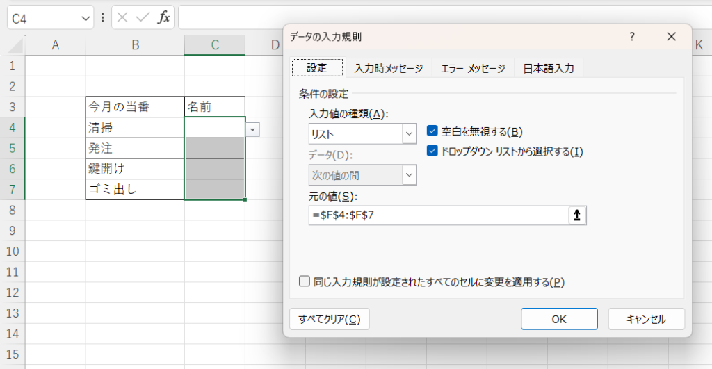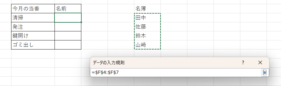名前一覧の部分を選択し、Enterを押し、OKボタンをクリックするとドロップダウンリストの作成ができます。