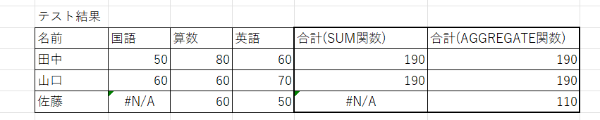 マークシートなどで入力や取り込みエラーで佐藤さんの国語の点数にエラーが生じた場合にSUM関数の場合エラーが含まれていると結果もエラーになってしまいます。