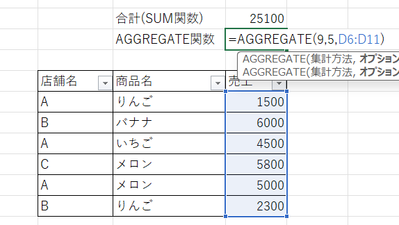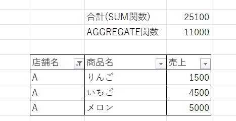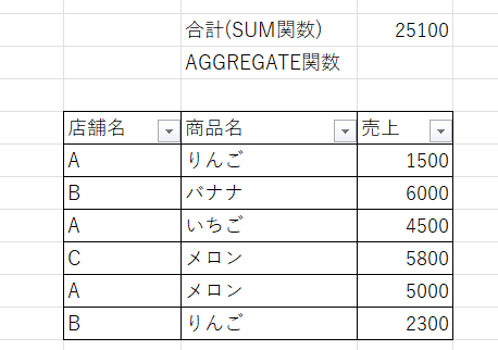 売上表のうち、店舗AだけにフィルターをかけてもSUM関数の合計は25100から変わりませんが、我々が知りたいのは店舗Aの売り上げ合計なのでAGGREGATE関数を使用します。