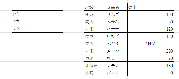 集計ミスでエラー値も入っている状態で売上上位を求めます。