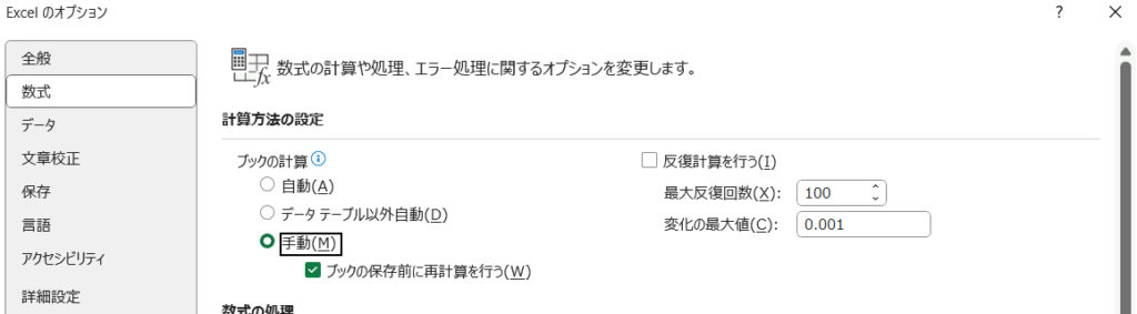 これがオンになっていると、手動計算モードでも保存時に強制的に再計算が走ることがあります。