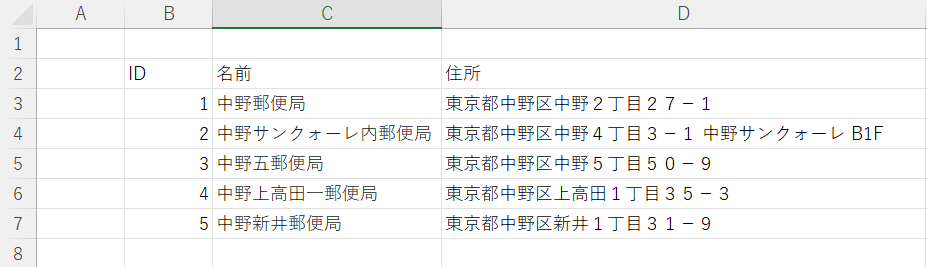 今回は例として中野区の5個の郵便局を患者5名として作成します。