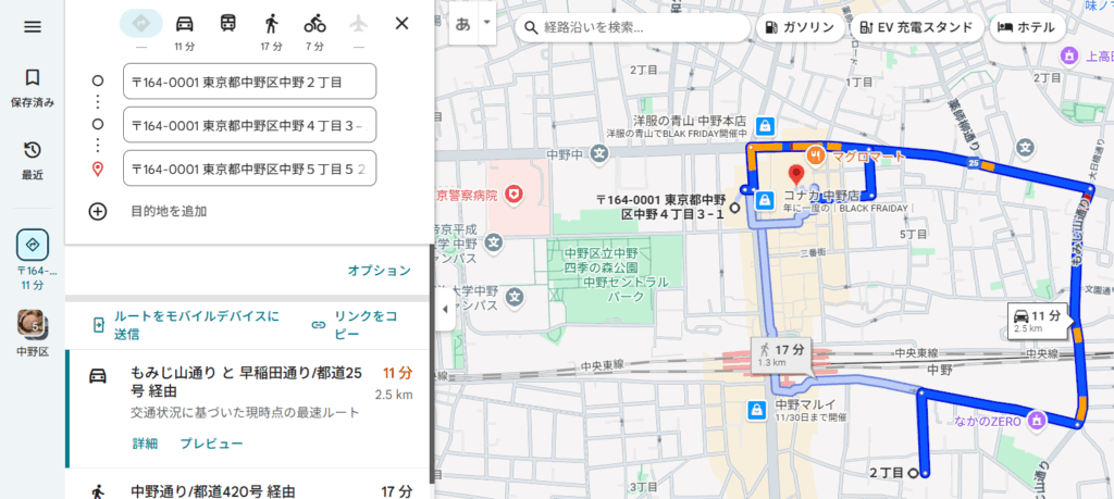 職場(ゴール)は固定なので手入力しています。今回は中野ブロードウェイを職場としています。