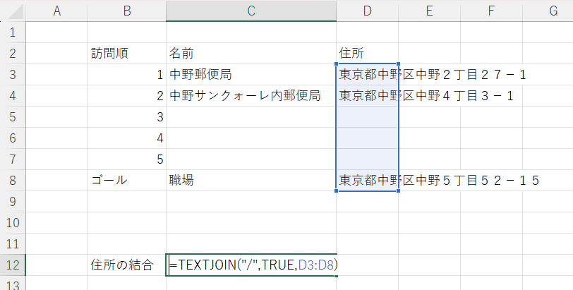 住所を「/」で全て結合するためにTEXTJOIN関数を使用します。