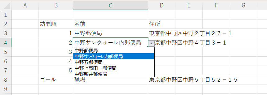 新しいシートに訪問順を入れるリストをデータの入力規則で作成し、住所をVLOOKUP関数を用いて自動検索します。