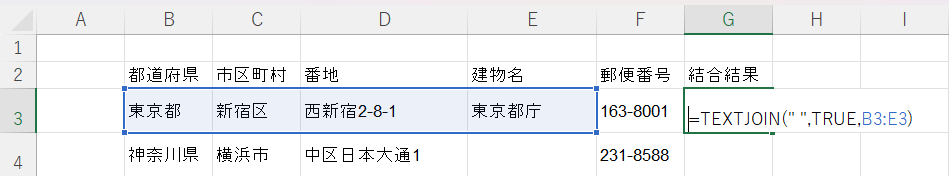 空白を無視: ここに TRUE を指定することで、建物名などデータがないセルを無視でき、余計な区切り文字が入るのを防げます。