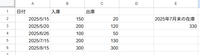 例えば、A列に日付、B列に入庫数、C列に出庫数がある場合、2025年7月末の在庫を求めるには、条件範囲に日付を指定し、条件に「”<=”&EOMONTH(“2025/7/1”, 0)」と指定します。