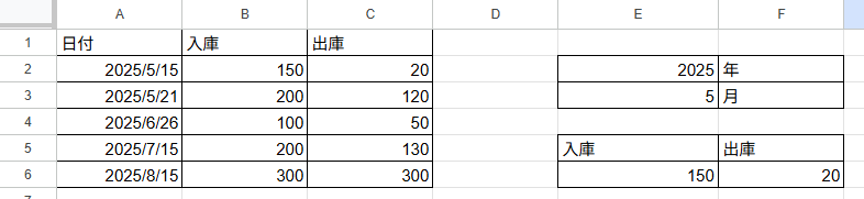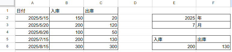 E2とE3セルに日付を入力できるようにしているためこの日付を変更するだけで入出庫数が自動で切り替わります。